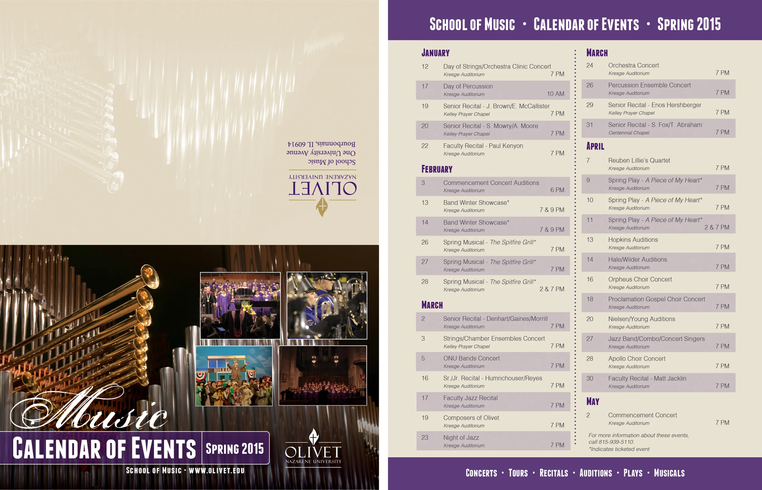 Calendar of events for Olivet Nazarene University's School of Music. I used my own photography and photos on file, a color scheme to link the calendar with the school as a whole, and effective layout of information.